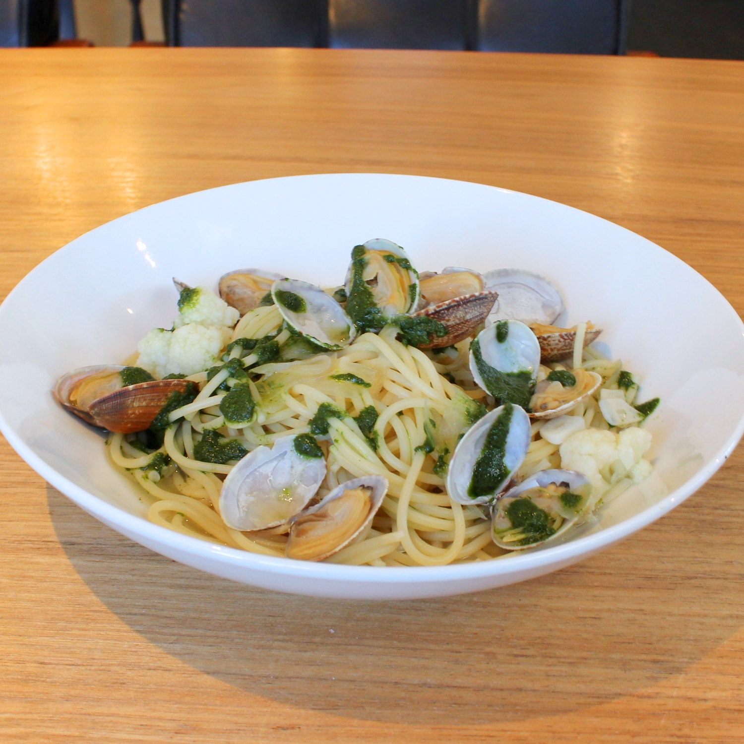 大葉のジェノベーゼソースをかけました。だしを効かせた和パスタです。