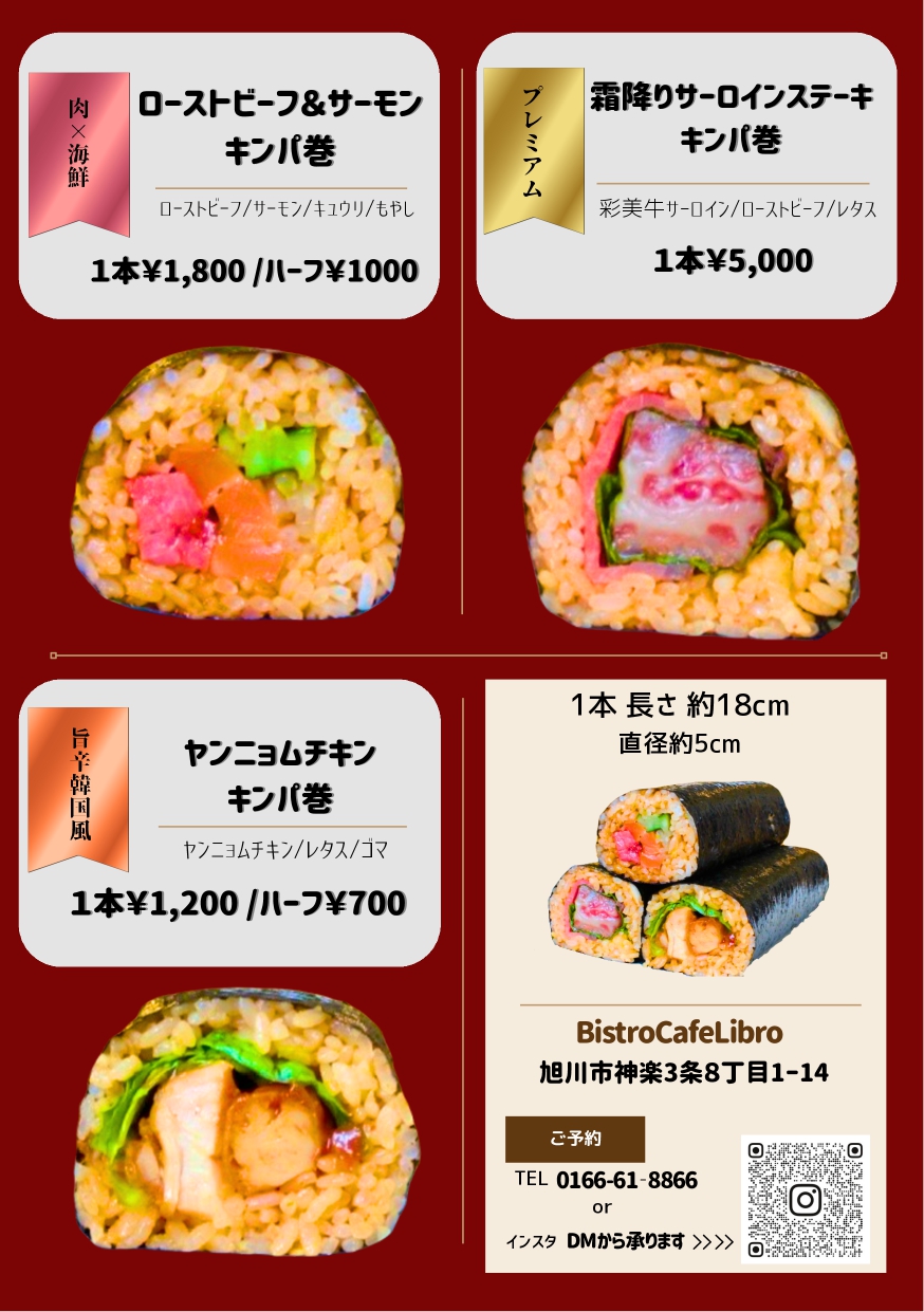 ・ローストビーフ&サーモンキンパ巻 1本1,800円 / ハーフ1,000円
